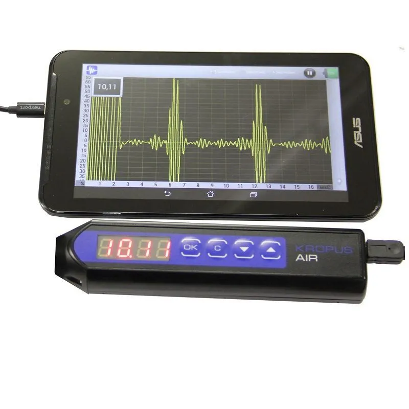 ЭМА толщиномер AIR работает как автономно, как и с подключением к планшету с системой Android, позволяя наблюдать реальный радиосигнал на экране в режиме толщиномера или дефектоскопа.